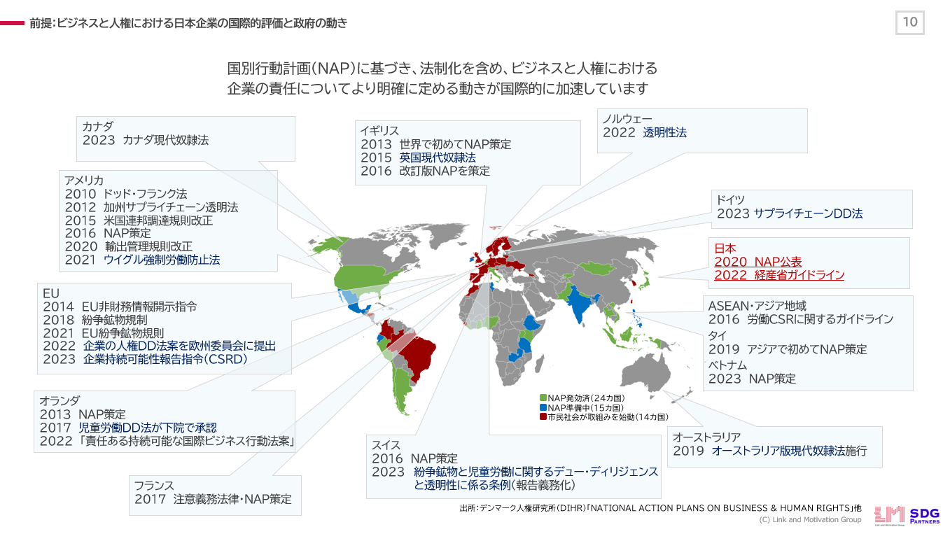 日本では、国際的な人権尊重の動向に沿って、政府が2020年に「ビジネスと人権に関する国家行動計画(NAP)」を策定しました。法務省や経産省は企業の対応を示唆するガイドラインを公表しています。