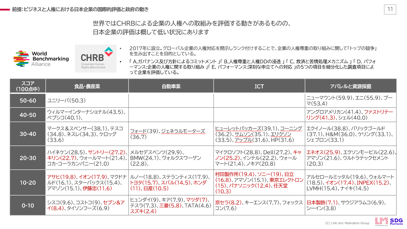 実際、企業の人権尊重ベンチマーク(CHRB)のスコアでも、日本企業が他のグローバル企業よりも評価が低い傾向にあります。