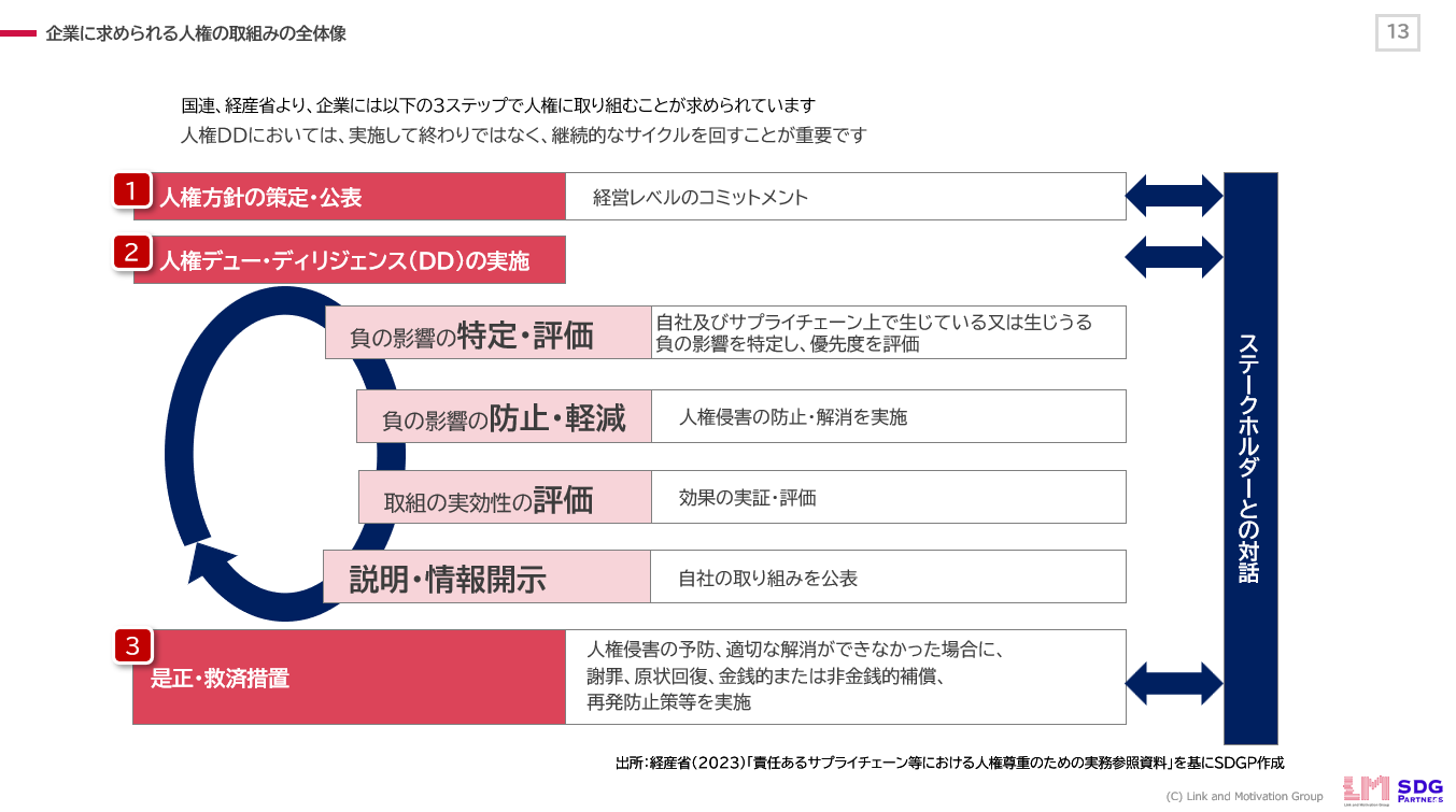 日本政府の人権デュー・ディリジェンス・ガイドラインに従い、企業は「人権方針の策定」「人権デュー・ディリジェンスの実施」「救済手段の確立」の三つの主要な取り組みを行うことが求められています。