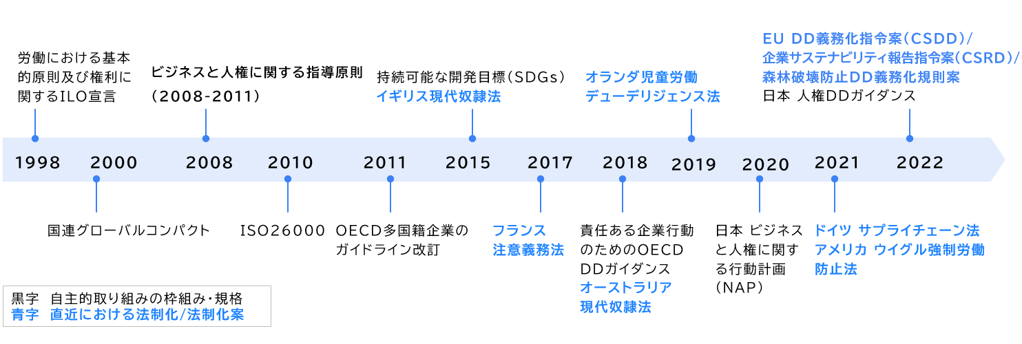 例えば、欧州連合では企業サステナビリティ・デュー・ディリジェンス指令(CSDDD)が2024年に施行されました。、企業には自社およびバリューチェーンへの悪影響を特定・評価し、それを防止・軽減・是正するプロセスを構築・実行する義務が課されています。人権DDの歴史的背景